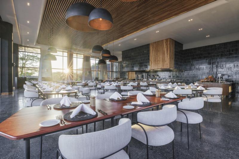 The lodge offers a diverse culinary experience, from 5-course wine-paired dinners to traditional Tanzanian dishes, live cooking stations, fresh juice bars, and relaxed poolside dining with breathtaking views of the Serengeti plains.